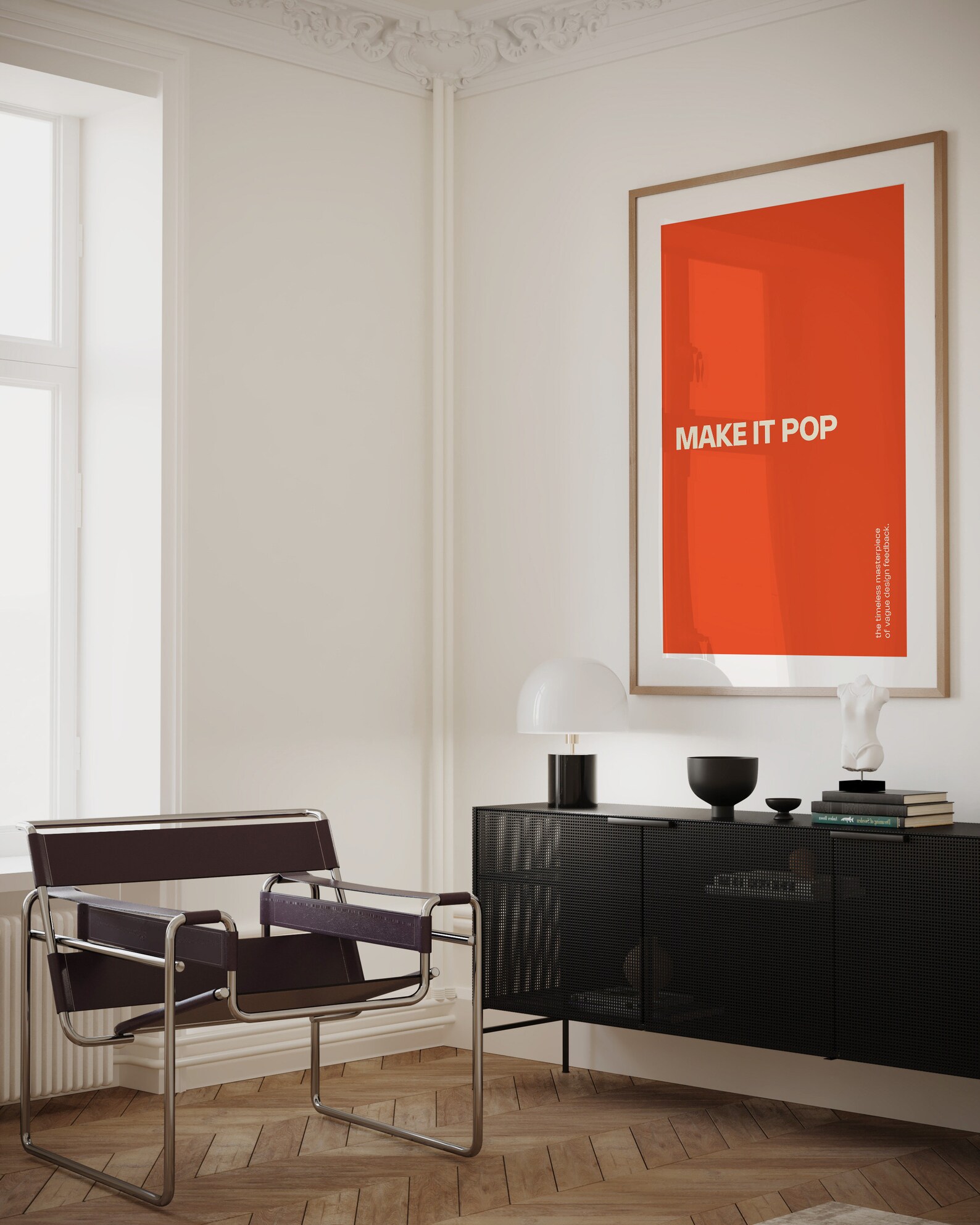 A playful graphic design poster that captures the classic designer phrase, “Make it pop.” Designed in a swiss-inspired style, this poster adds humour, personality, and creative studio energy to any workspace.
