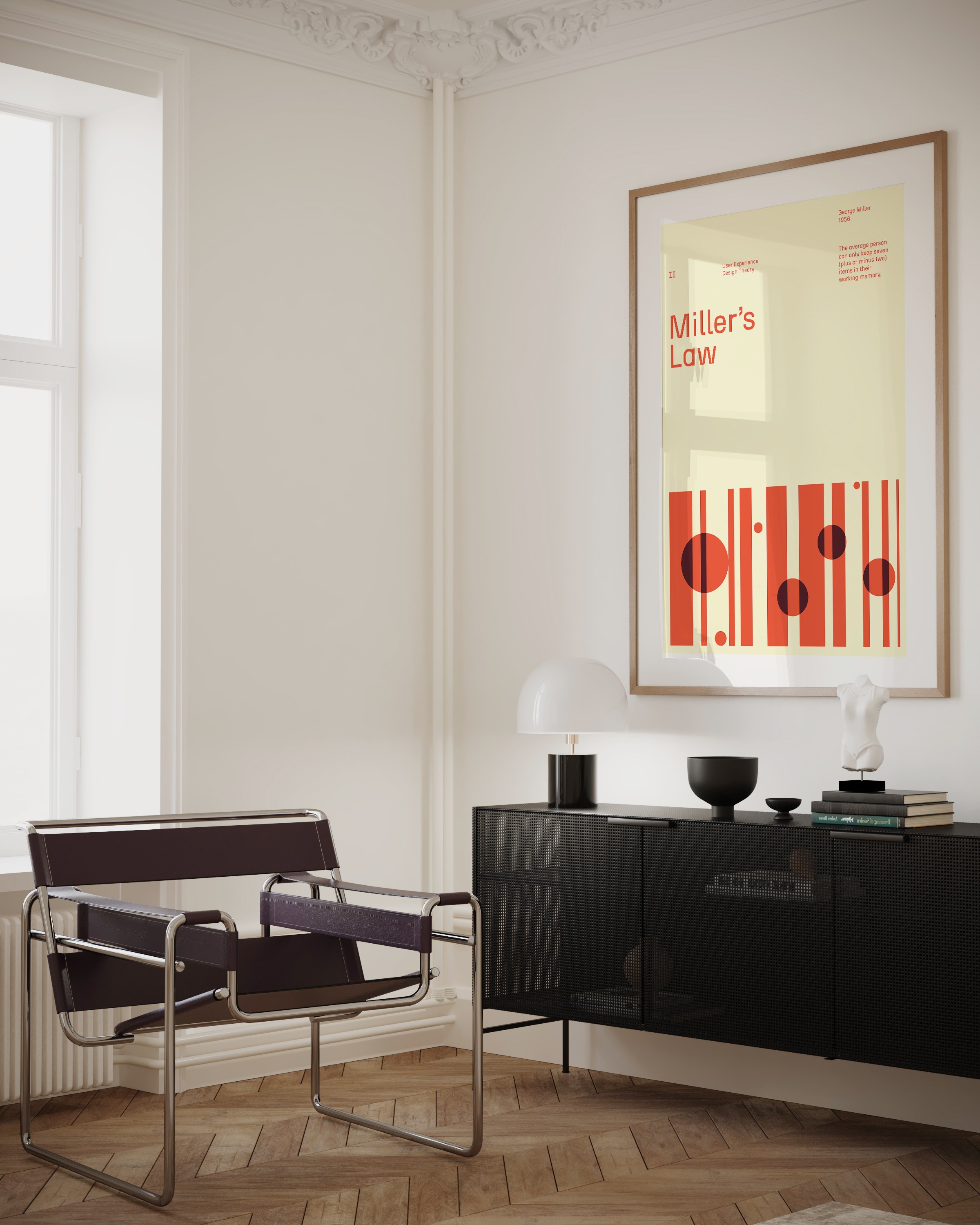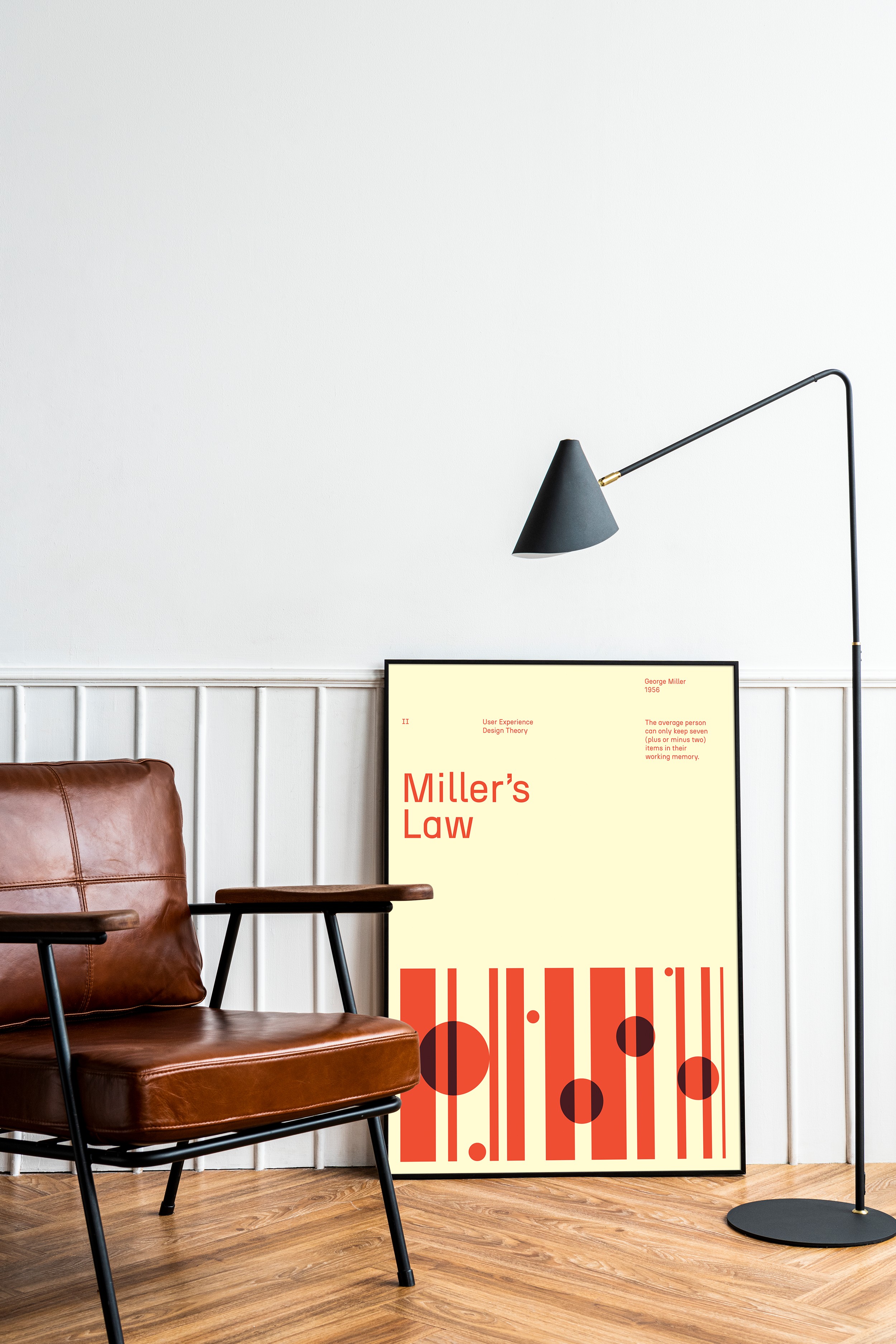 A graphic design poster that is both stylish and a thoughtful reminder of a key UX design principle. This educational design poster highlights Miller’s Law through Swiss-inspired visual design, making it a clean and inspiring reference for designers.